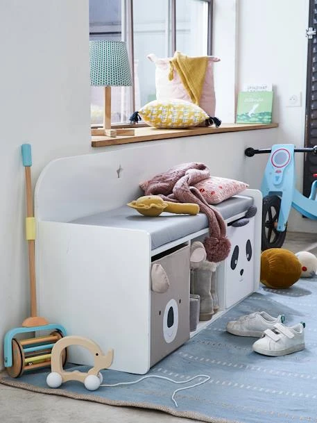 Voici une jolie banquette qui peut accueillir 3 bacs de rangement (vendus sur ce site). Votre enfant pourra s’y asseoir pour lire ou pour se chausser plus facilement !