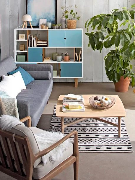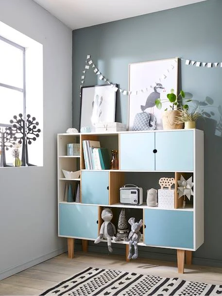 Un design inspiré des pays scandinaves et un camaieu de bleus tendres ; ce meuble de rangement a vraiment tout pour plaire ! D’un côté, la déco se montre grâce aux niches ouvertes, de l’autre, les petites affaires se cachent derrière les placards !