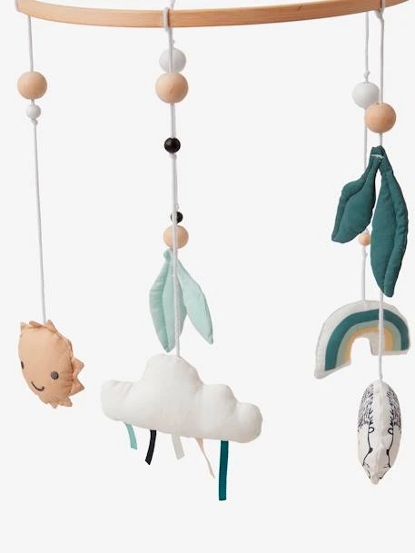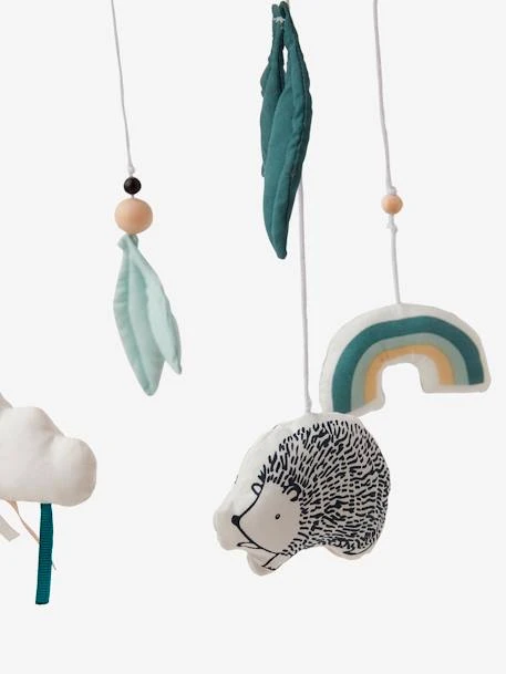- Mobile musical comprenant 5 suspensions composées de feuilles, d’un nuage, d’un soleil et d’un hérisson