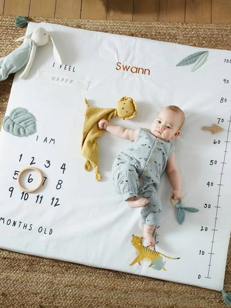 Hello joli baby ! Photographiez la croissance de bébé mois après mois avec ce joli tapis de sol ! Le petit + : il se personnalise ! Un anneau pour entourer l’âge, une flèche pour indiquer la taille et 6 étiquettes textiles avec des adjectifs pour finaliser vos photos et créer de super souvenirs !